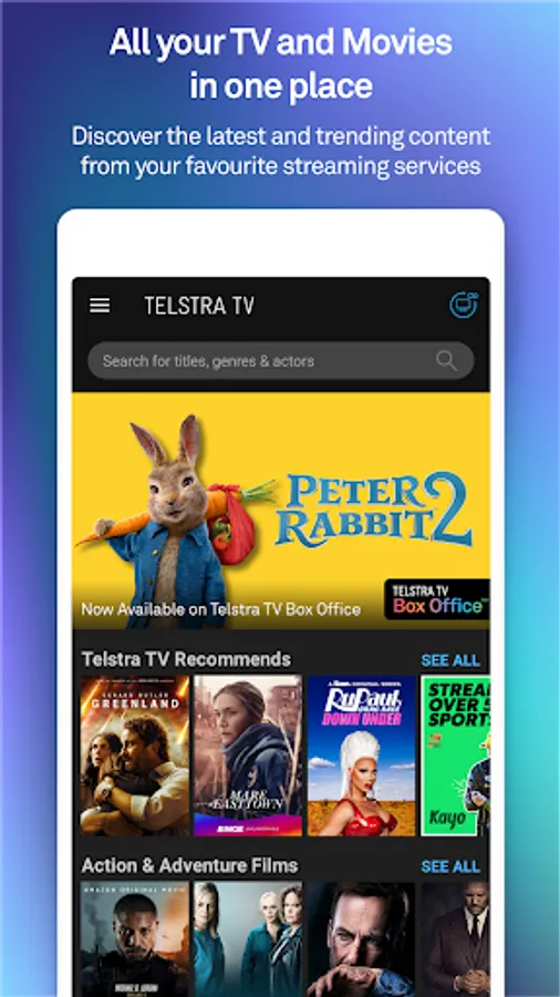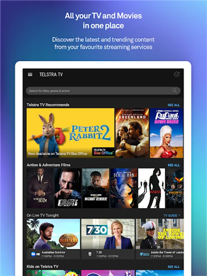 The Telstra TV app brings together the best international and local streaming services allowing you to search across a wide range of movies, TV shows, sport, and free-to-air TV.