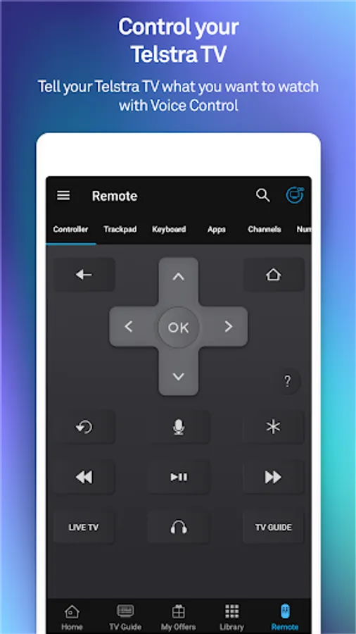 The app also includes a virtual remote that can be used to control your Telstra TV just like the physical remote, including voice search.