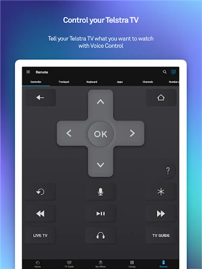● Use your mobile device as full virtual remote for your Telstra TV including launching apps, changing TV channels and voice control
