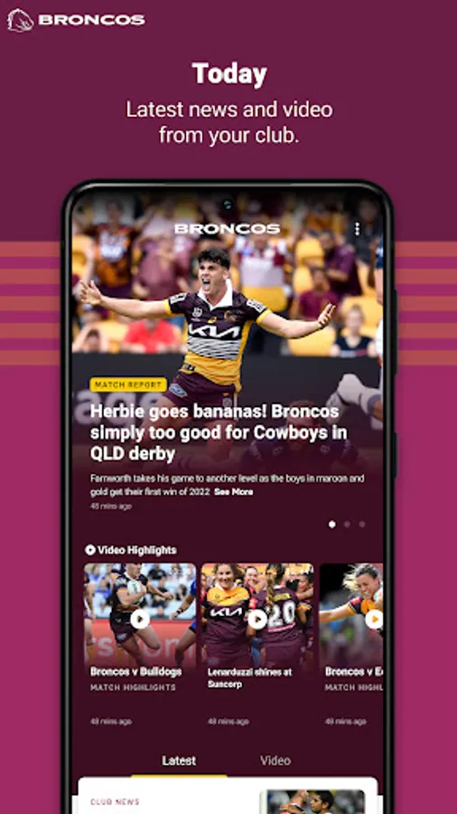 Welcome to the brand new Official Brisbane Broncos app. Our completely redesigned experience gives you access to your favourite team and favourite players - plus you'll get breaking Brisbane Broncos news, live scores, stats, game day information and match highlights. It's everything you need to know about the Brisbane Broncos, no matter where you are.