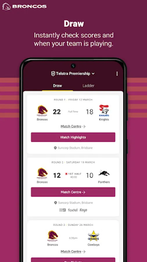 The Official Brisbane Broncos app will keep you in the front row. Download now and never miss a minute of the greatest game of all!