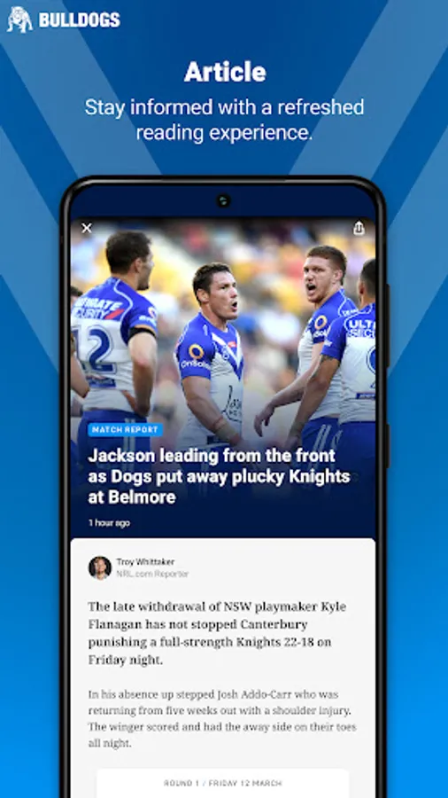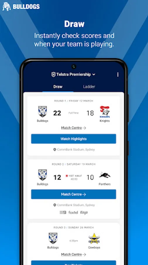 The Official Canterbury-Bankstown Bulldogs app will keep you in the front row. Download now and never miss a minute of the greatest game of all!
