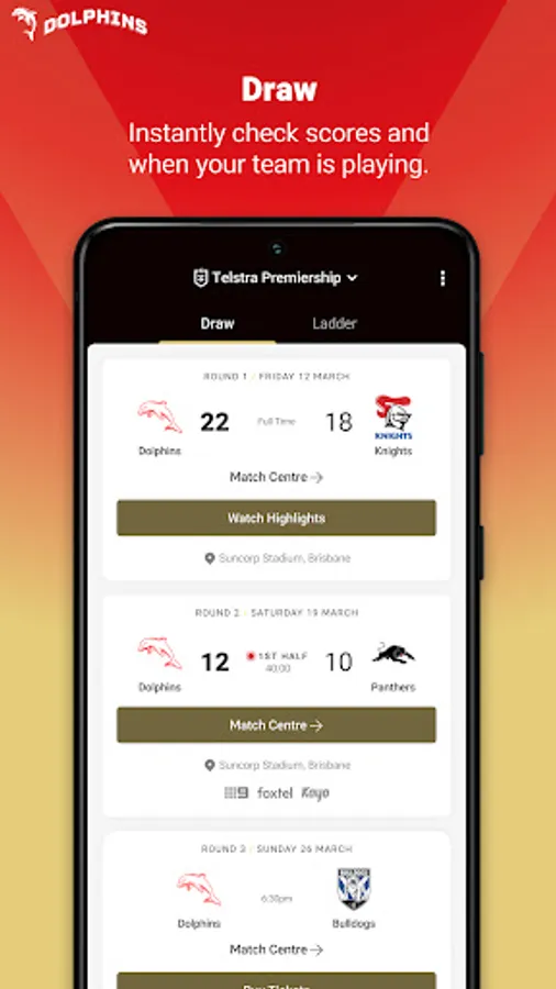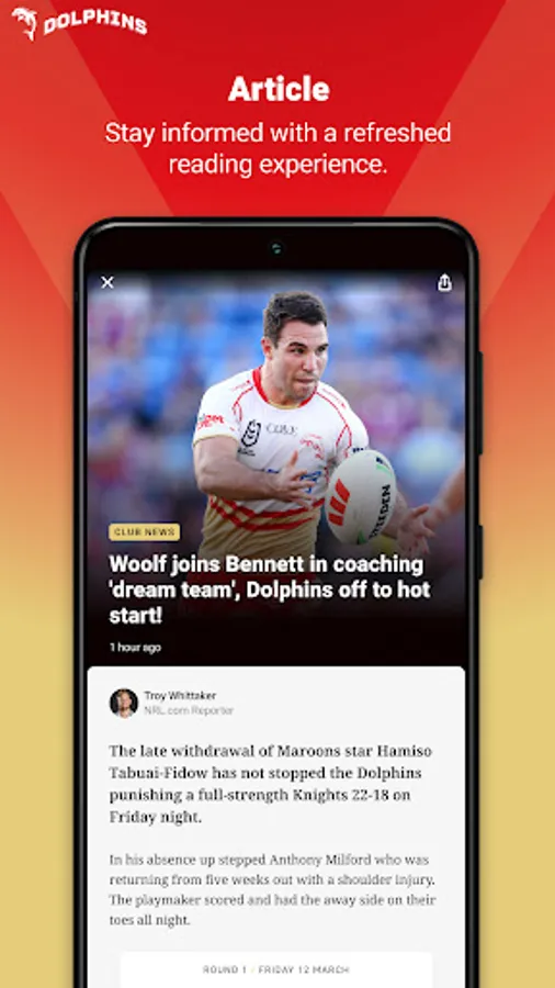 Welcome to the brand new Official Dolphins app. Our completely streamlined experience gives you access to your favourite team and favourite players - plus you'll get breaking Dolphins news, live scores, stats, game day information and match highlights. It's everything you need to know about the Dolphins, no matter where you are.