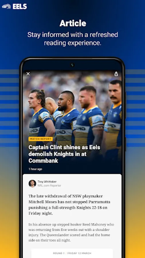 Welcome to the brand new Official Parramatta Eels app. Our completely redesigned experience gives you access to your favourite team and favourite players - plus you'll get breaking Parramatta Eels news, live scores, stats, game day information and match highlights. It's everything you need to know about the Parramatta Eels, no matter where you are.