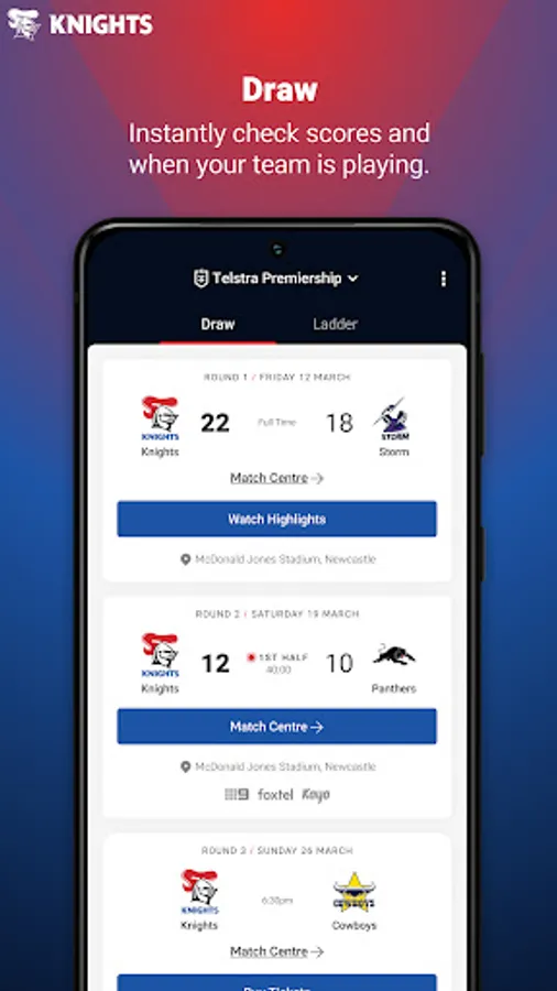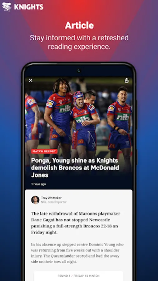 Welcome to the brand new Official Newcastle Knights app. Our completely redesigned experience gives you access to your favourite team and favourite players - plus you'll get breaking Newcastle Knights news, live scores, stats, game day information and match highlights. It's everything you need to know about the Newcastle Knights, no matter where you are.