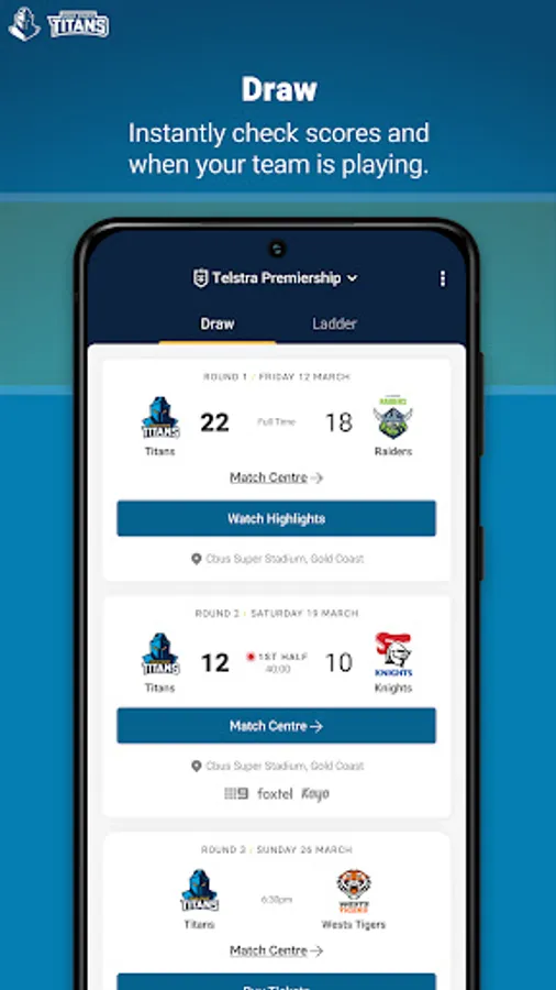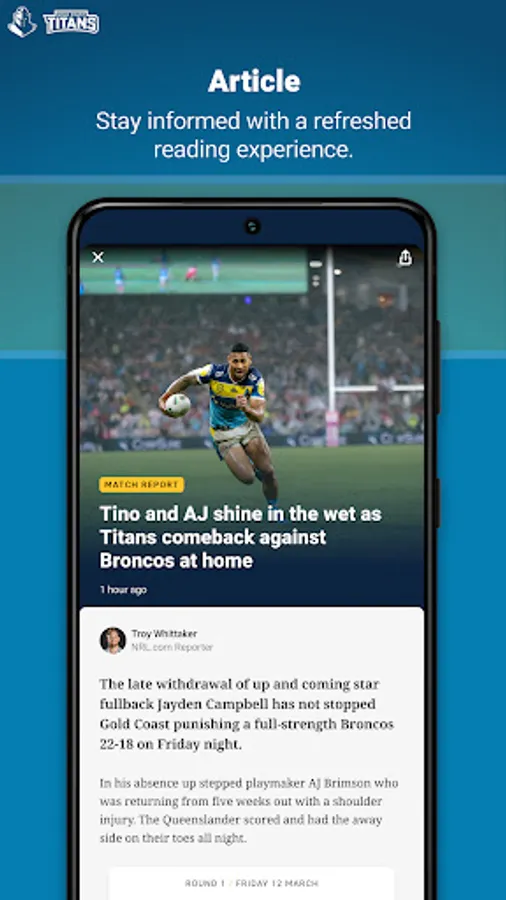 Welcome to the brand new Official Gold Coast Titans app. Our completely redesigned experience gives you access to your favourite team and favourite players - plus you'll get breaking Gold Coast Titans news, live scores, stats, game day information and match highlights. It's everything you need to know about the Gold Coast Titans, no matter where you are.