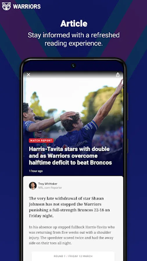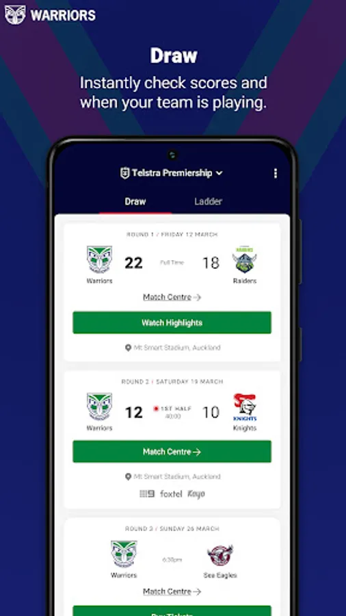 Welcome to the brand new Official New Zealand Warriors app. Our completely redesigned experience gives you access to your favourite team and favourite players - plus you'll get breaking New Zealand Warriors news, live scores, stats, game day information and match highlights. It's everything you need to know about the [New Zealand Warriors, no matter where you are.
