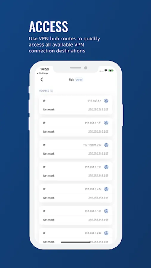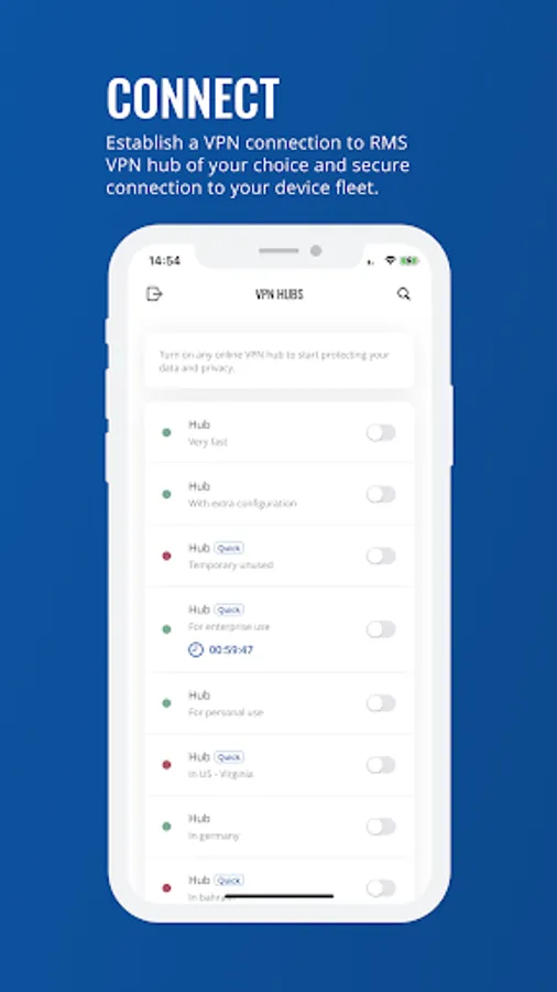To establish a private and secure connection, all you need to do is create a VPN Hub in RMS, add new clients and devices from a list. After that, you will be able to turn on LAN or WAN forwarding and set up routes for reaching one or multiple end devices within the client's LAN or WAN network in just a few clicks. After setup use RMS VPN client app to connect to pre-configured hub.