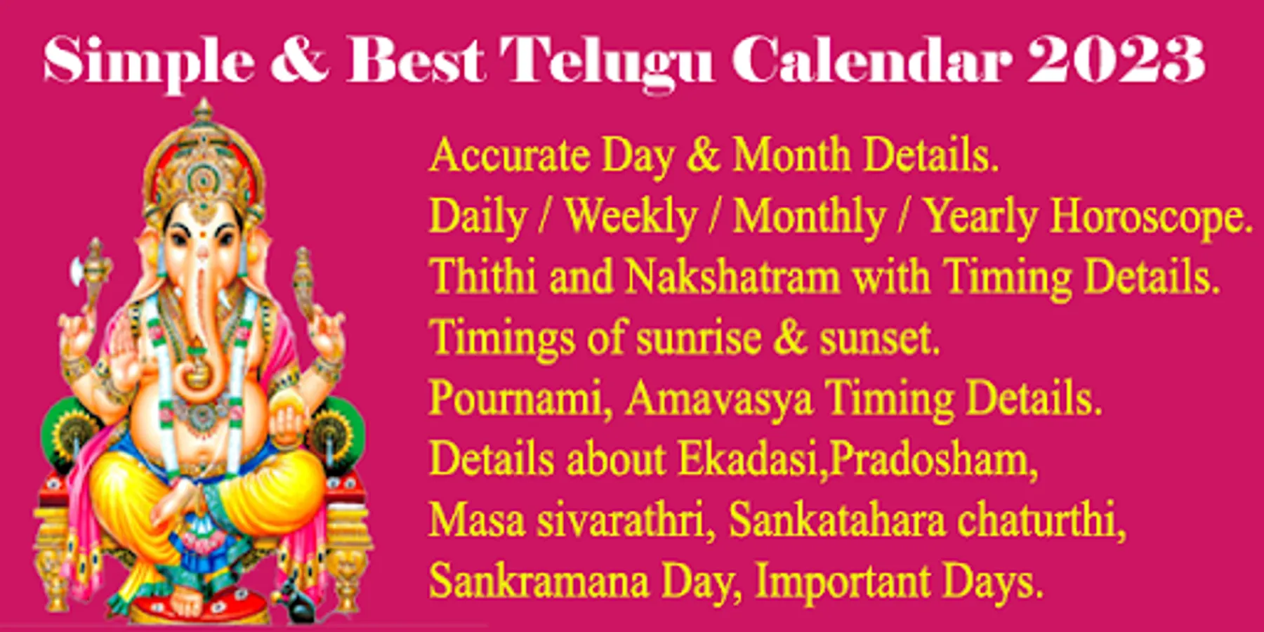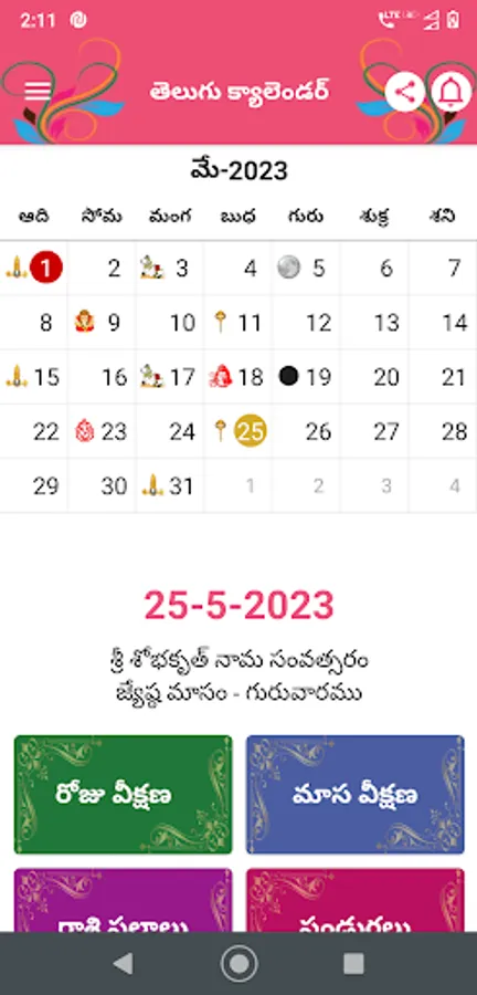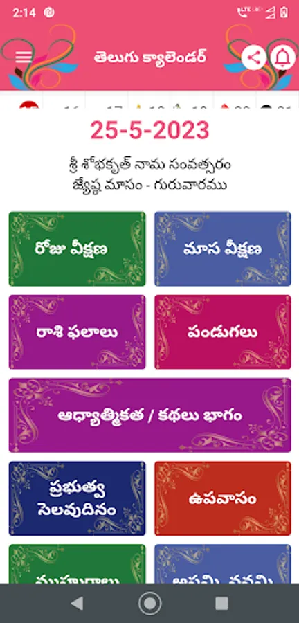 Telugu calendar app provides the details about telugu panchangam with auspicious day details. Telugu calendar 2023 for telugu speaking people across the world.