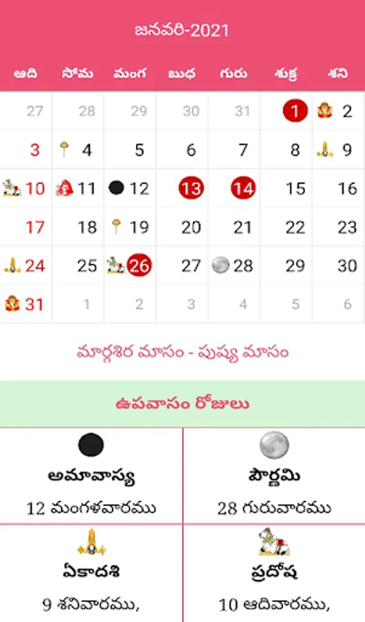 Month view of Telugu calendar has fasting days, Government holidays and festival days are highlighted.