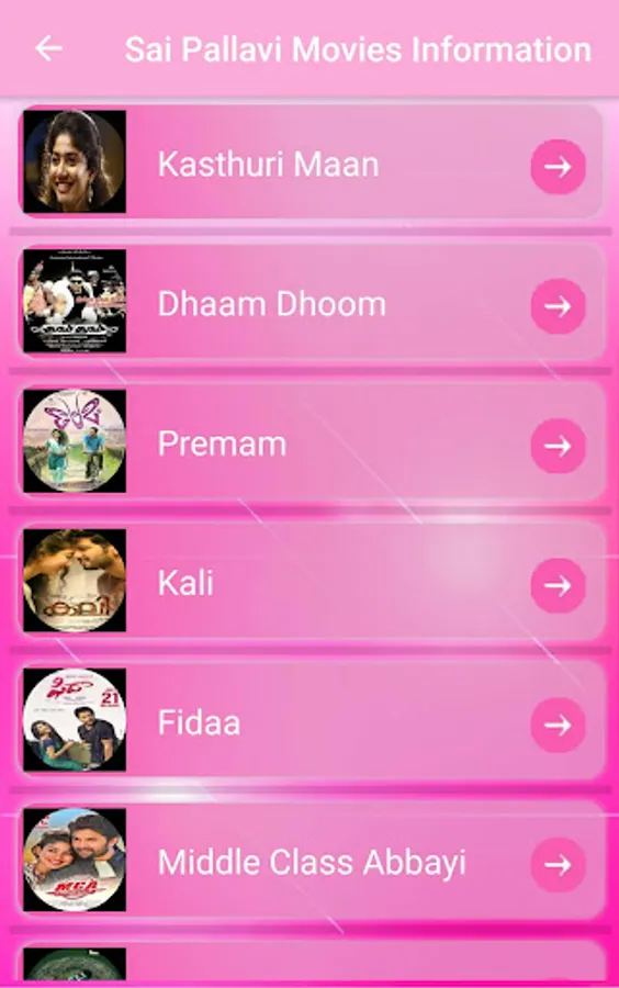 This Application display the information of Sai Pallavi movies, it will not play any video or audio of her movies, It is a multi purpose application to Sai Pallavi followers, App contains four options.