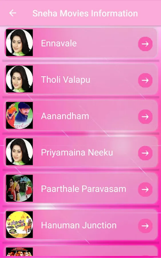 This Application display the information of Sneha movies, it will not play any video or audio of her movies, It is a multi purpose application to Sneha followers, App contains four options.