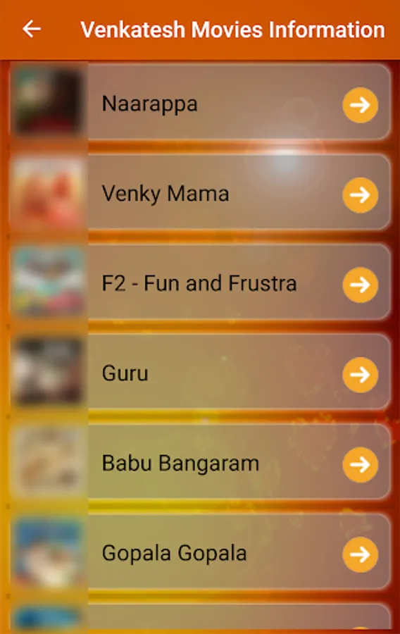 This Application display the information of Venkatesh movies, it will not play any video or audio of his movies, It is a multi purpose application to Venkatesh fans, App contains four options.