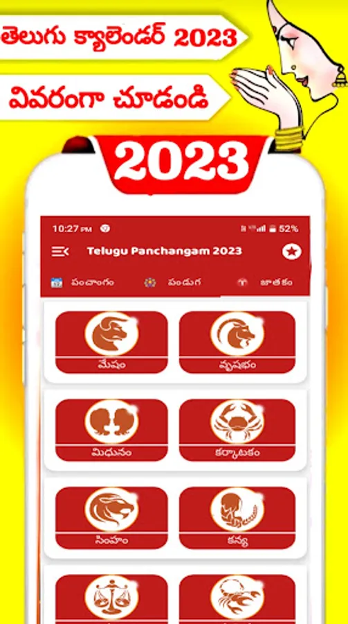 పంచంగా 2023 తెలుగు క్యాలెండర్ అనువర్తనం రోజూ అన్ని జాతకాలను కలిగి ఉంది - రోజువారీ జాతకం నెలవారీ జాతకం మరియు వార్షిక జాతకం
