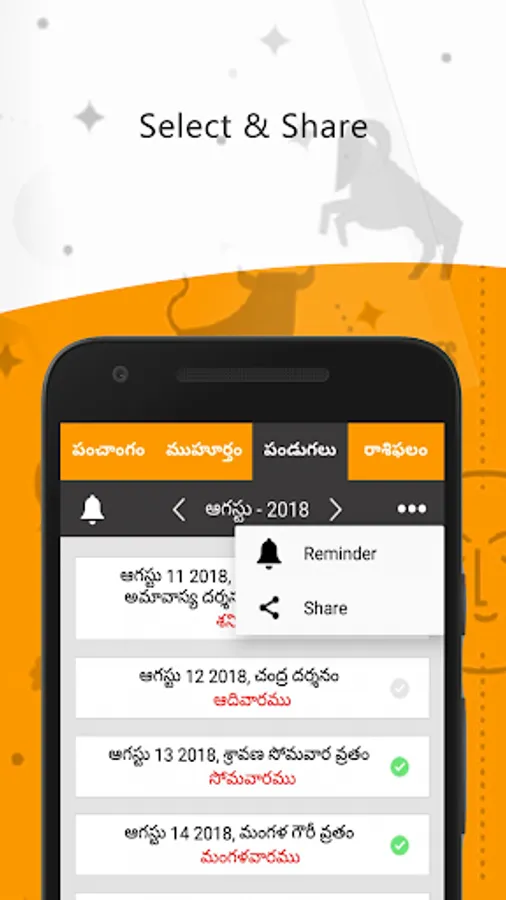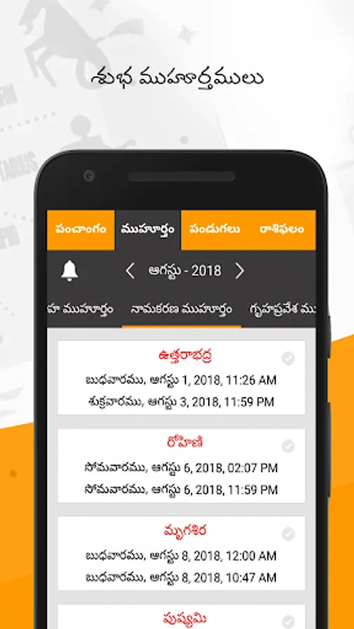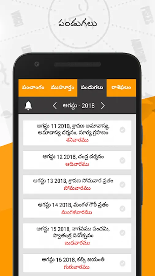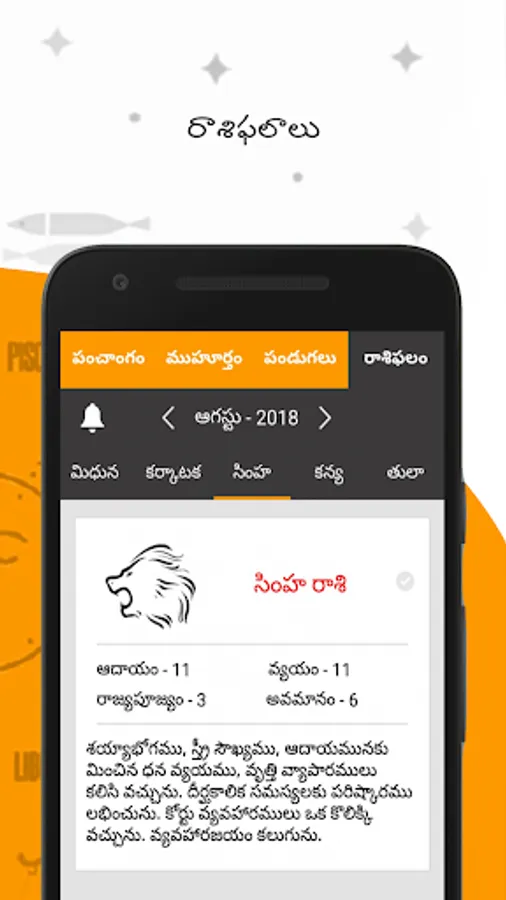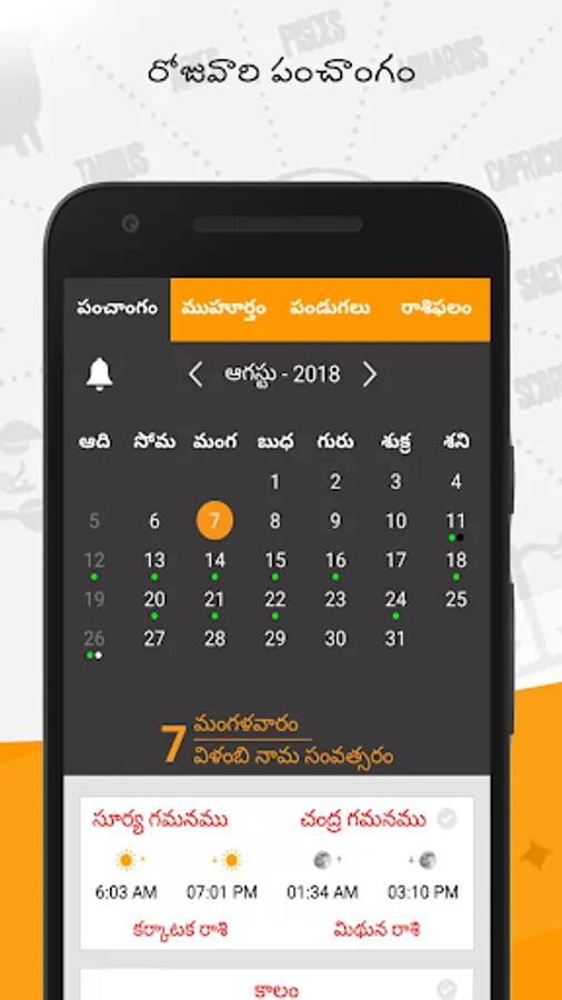Telugu calendar 2020 comes with four main tabs like Panchangam, Muhurtham, Festivals(Pandugalu), Rasi Phalalu(Horoscope).