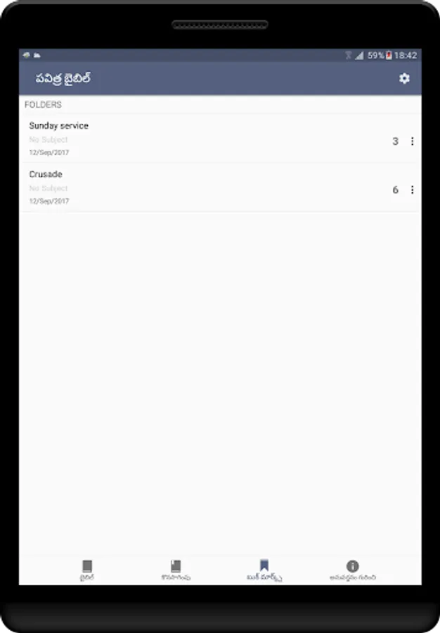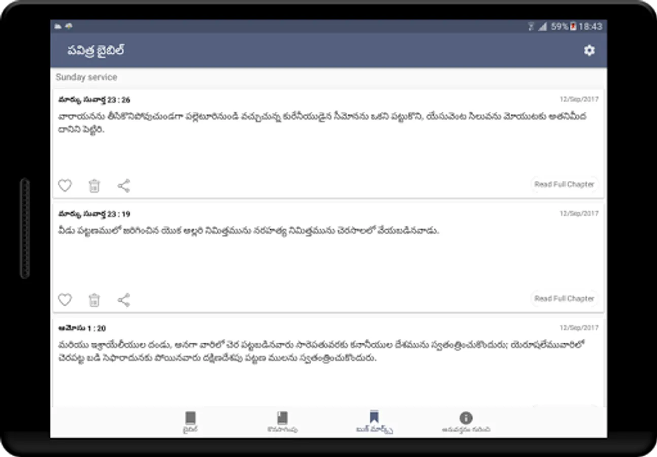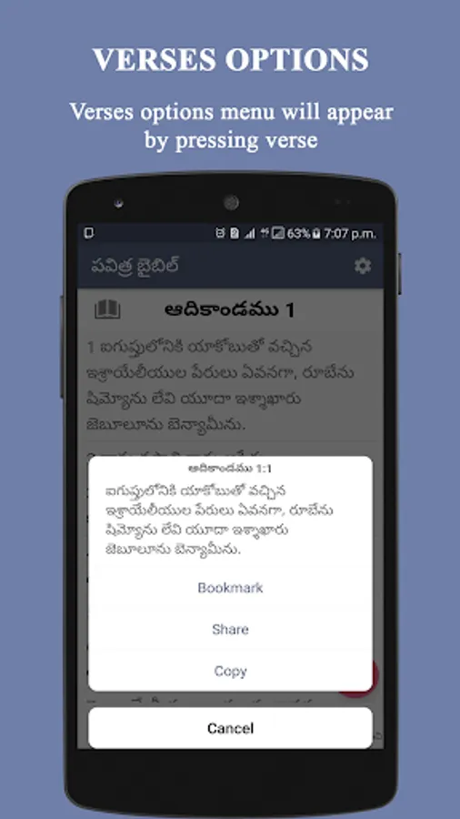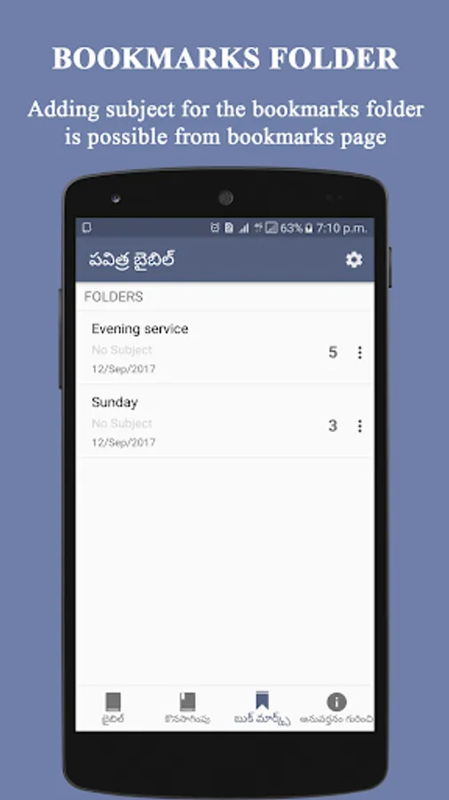 ★ Bookmark is one of the most highlighted features that can be done with the help of the bookmark option. A verse can be bookmarked in a single touch. The bookmarked verse can be saved folder wise. Renaming of folders is possible.