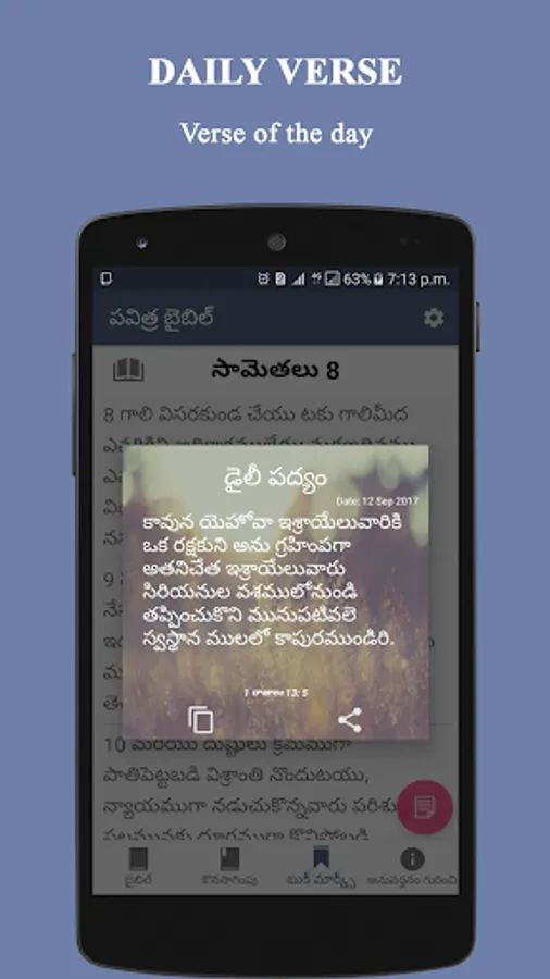 ★ The application encourages you to draw your friends and families closer to God by allowing sharing of the bible verses through social sites in a single touch.