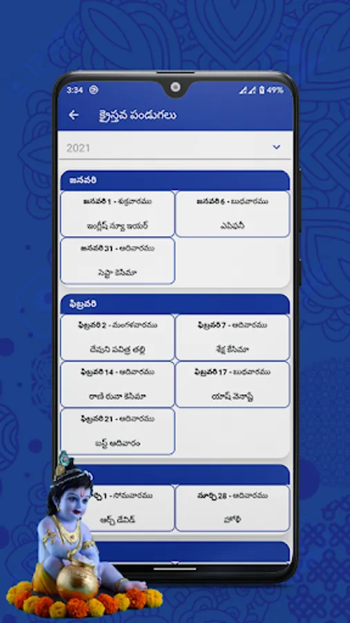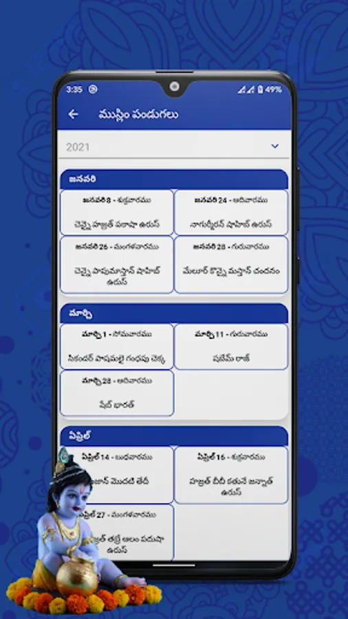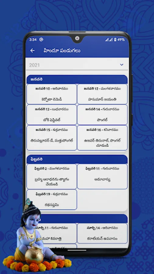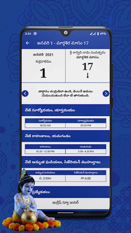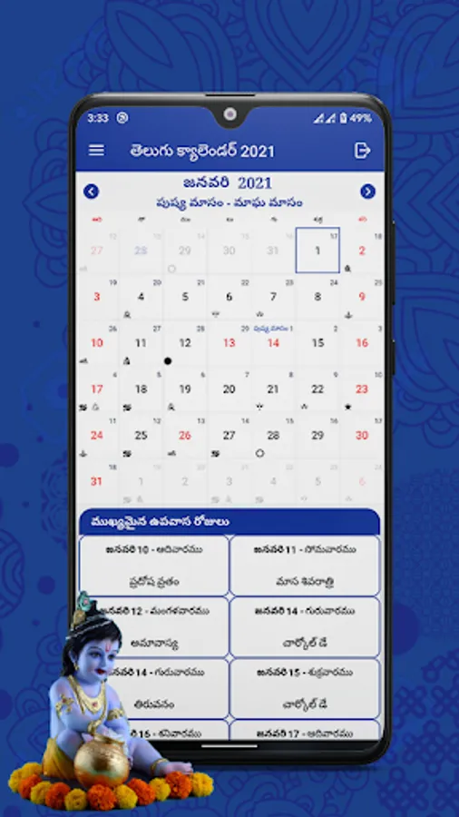 • Day view and Month view of 2021 Telugu calendar.