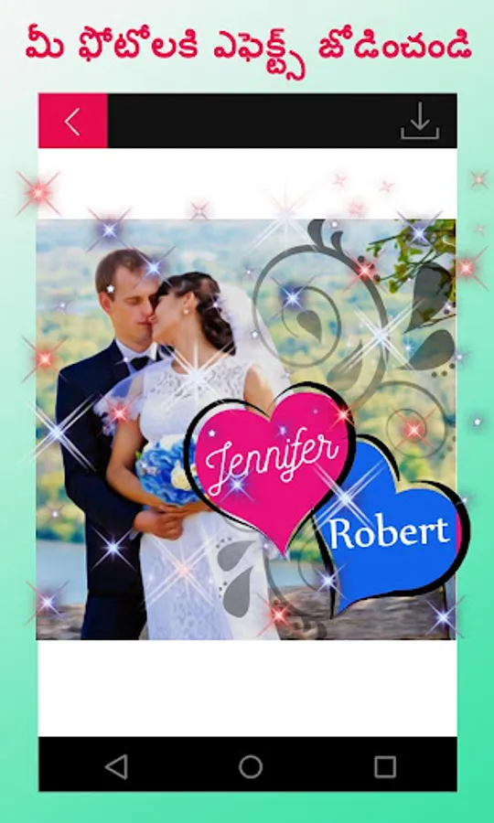 You have an option to select the text language i.e., English or Telugu. With text you can choose your love font, color, edit size text, drag, rotate your text. After that you can decorate it with different decorative item as flowers, feathers, strokes, fun stickers, color brush, color filter, heart shapes and art items.