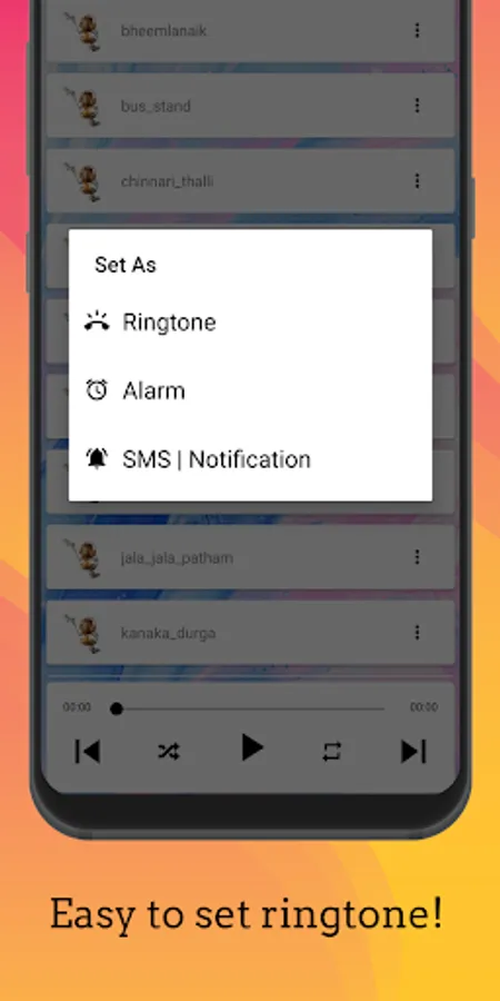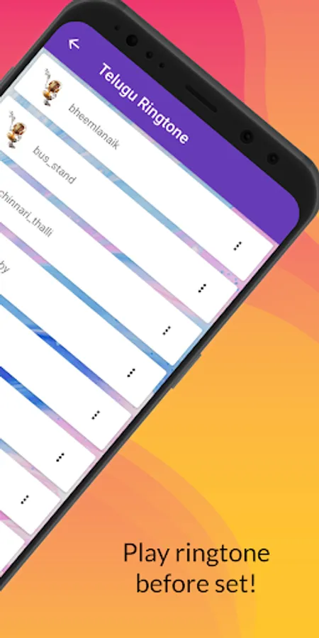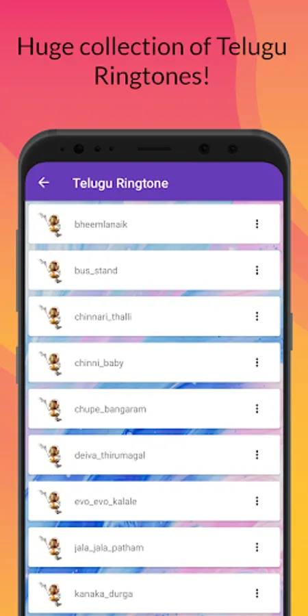 First, you can download this free Telugu Ringtones app, Then you can press the " play " button to listen to the ringtone, and to set it as ringtone click on three-dot(⋮) and choose the ringtone you are done!
