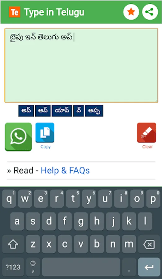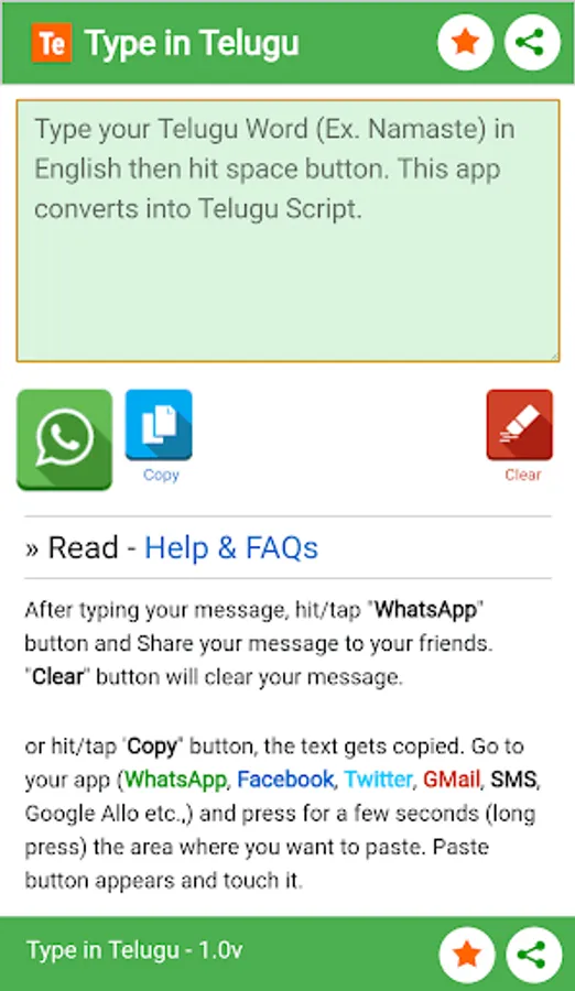 Type Telugu Words in English then press/tap SPACE button. This App automatically transliterated phonetically into Telugu Script.