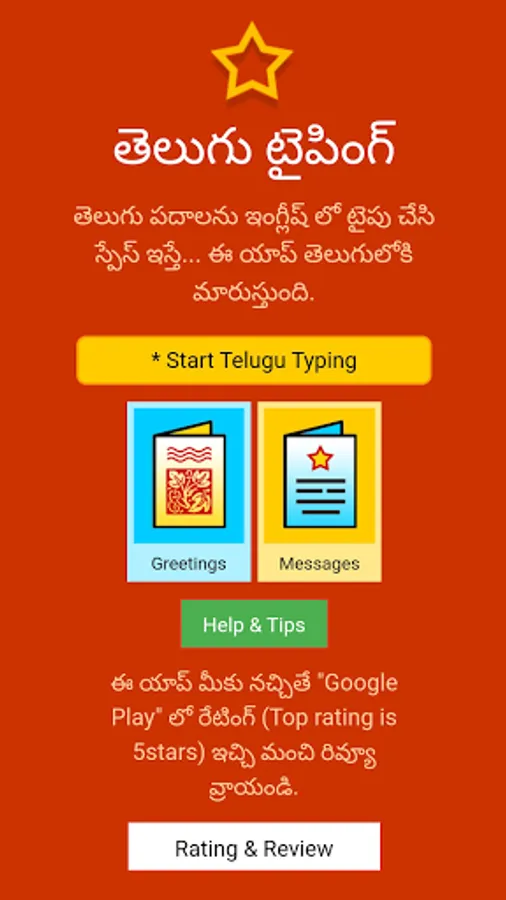 Telugu Typing (Type in Telugu) app is an English to Telugu transliteration tool. Type your Telugu words in English (Ex. Namaskaram and hit/tap space button). This app automatically converts into Telugu script.