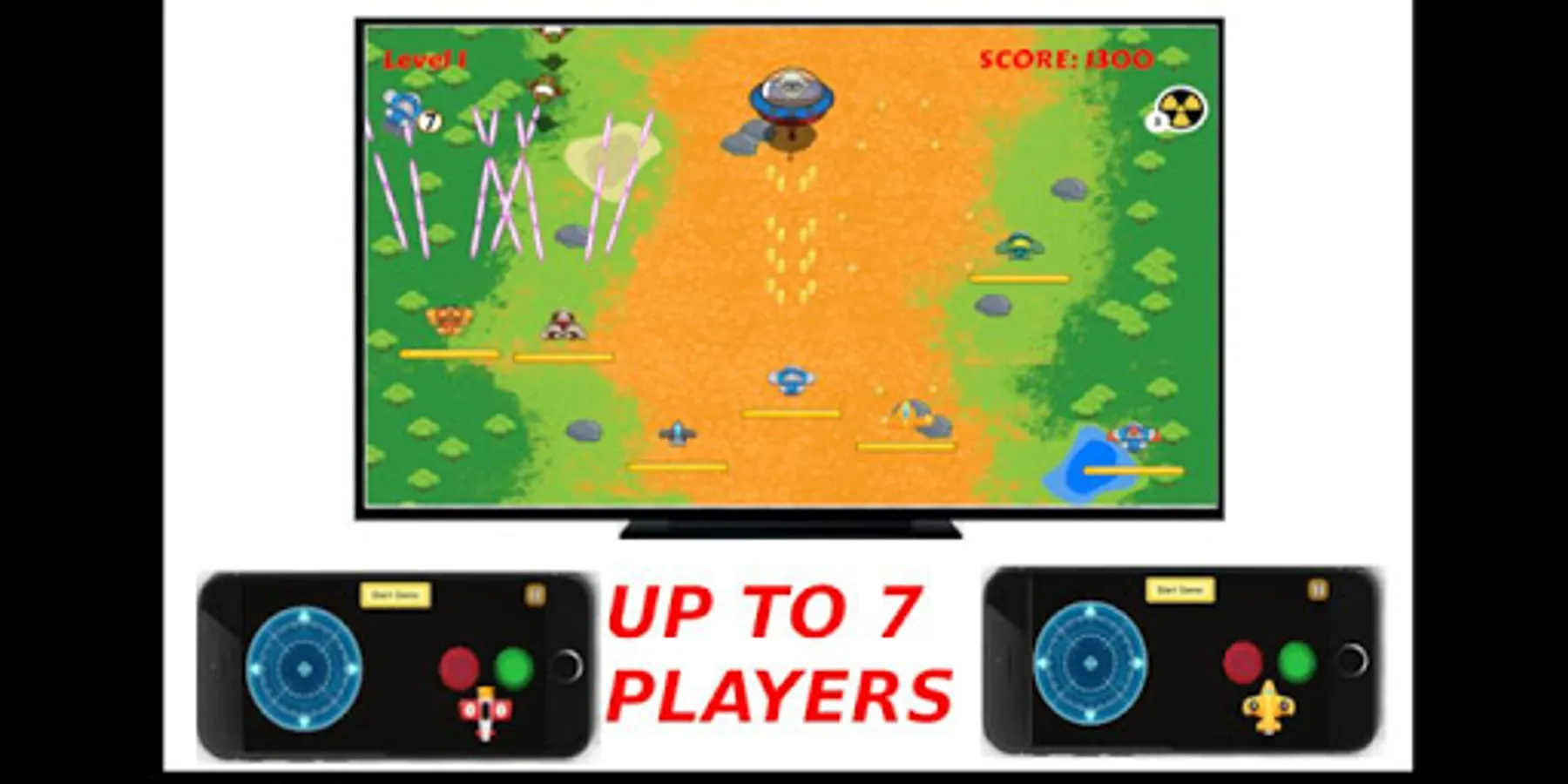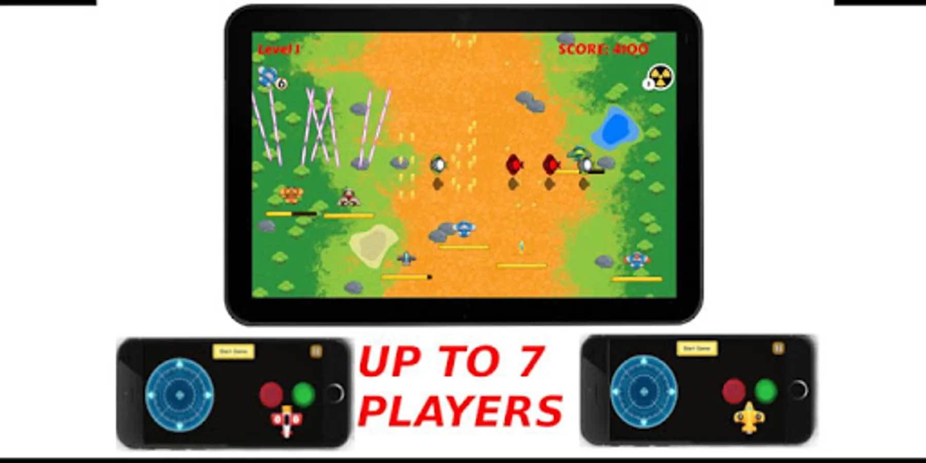 Sky Hunter : Royal Rumble is the answer. This game is retro arcade plane gaming and can played up to 7 players at the same time at the same screen.
