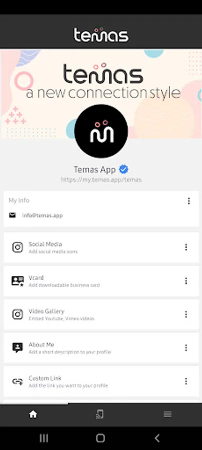 Temas is a digital business card with which you can share your social media accounts, contact information and much more with NFC and QR code.