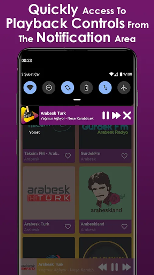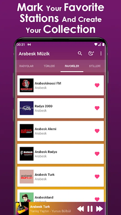 We add some radios that besides transmitting contemporary arabesque folk music and classical turkish music as its highest priority, also include the songs most heard in other genres such as foreign music, kurdish, Black Sea, arabian melodies, rhythms of darbuka, slow music, background music, thracian, zuhal, mixed arabesque, damar music, gypsy, pop, oldies, folk and rock.