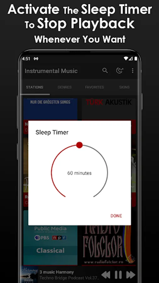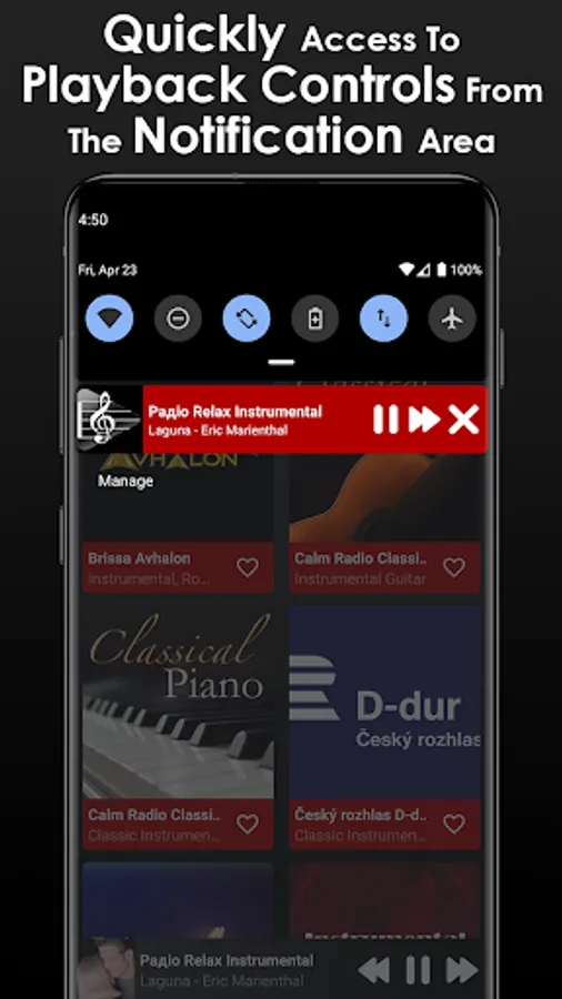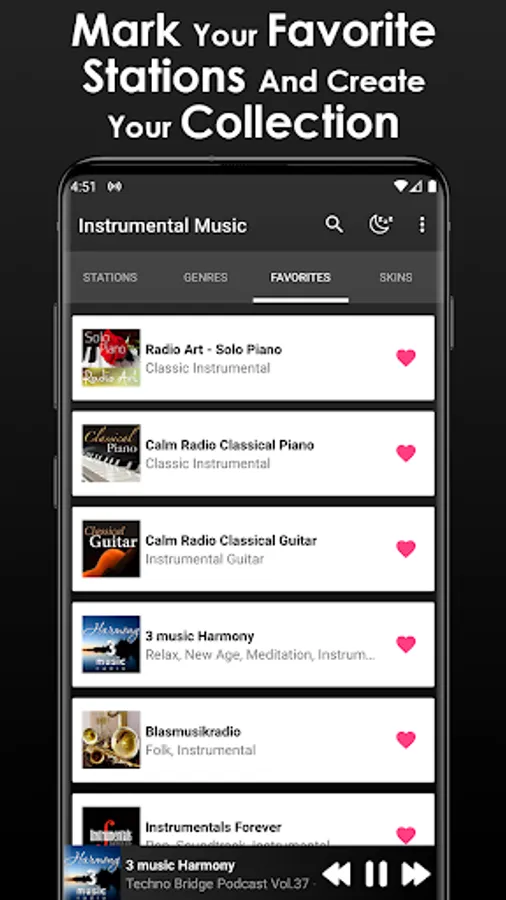 You can also listen to the most tuned instrumental music radios. This App does not work offline or without internet since it is necessary for the radio stations to be played correctly.