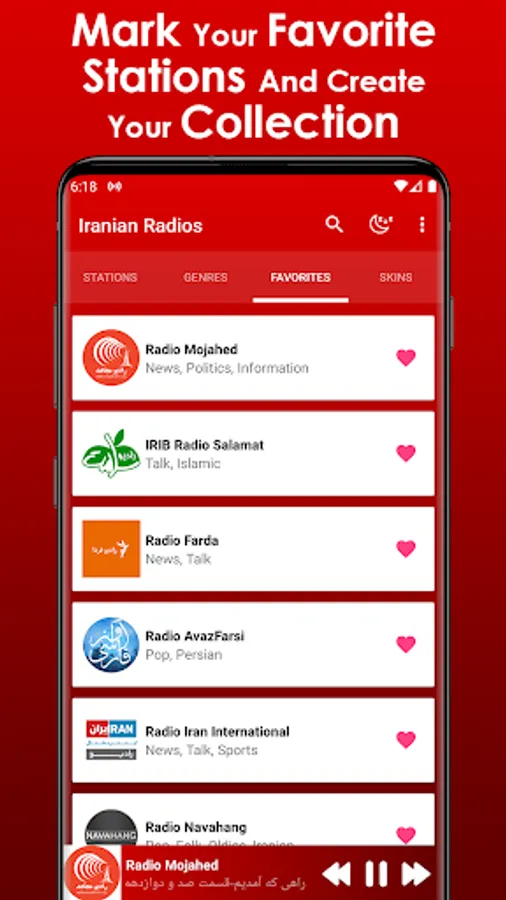The radio stations that you will find in this App are specialized in transmitting the best of Persian music, you will be able to tune in to the best hits of Iranian music, last Persian songs and you will be able to listen to the best music in the current Iran radio stations. You can also listen to news about of Iranian musical entertainment. Enjoy listening in this App the best music of Iran.