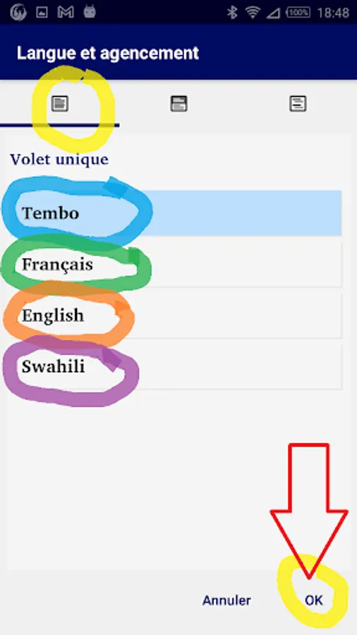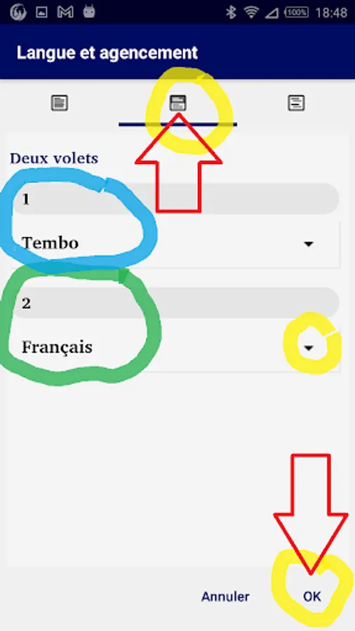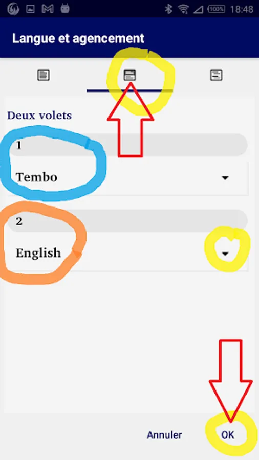 - "two panes" to display the Tembo at the top and at the same time the French or English or Swahili version at the bottom