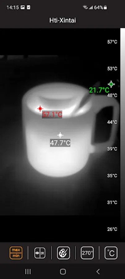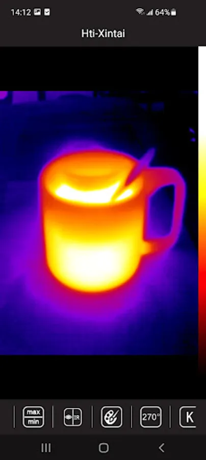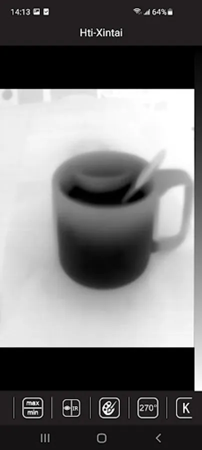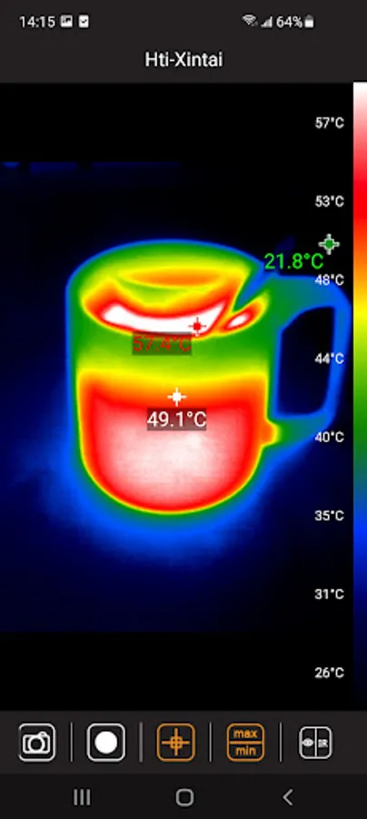 The software is HT-101 and HT-201 thermal imager supporting software. The software can display the image captured by the thermal imager, display the highest temperature, the lowest temperature and the central temperature of the picture, and store the picture of the thermal imager by taking pictures and videos. The software can display both the thermal imager picture and the front and back camera picture of the mobile phone, so that the user can recognize the object easily.