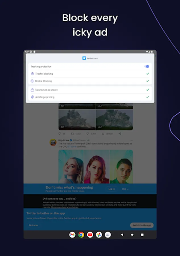 Our privacy panel displays the invasive stuff we’re blocking in real time. So you can roam the web with total confidence.