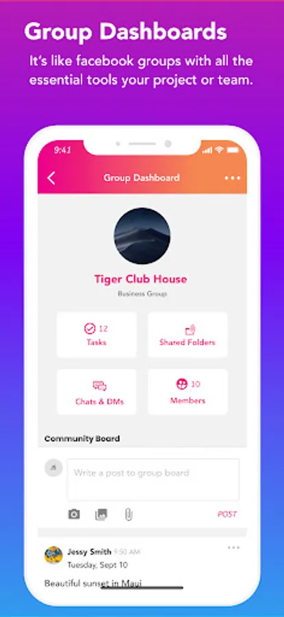 Groups. Create a group for each team or community of folks that you want to coordinate and collaborate with, such as clients or friends and other workers or freelancers. A great example is a team that you want to work with on a given task or project. Once the group is created, members post and share information with one another on the Group Community Board. Each Group Community Board is only visible to members of that group.