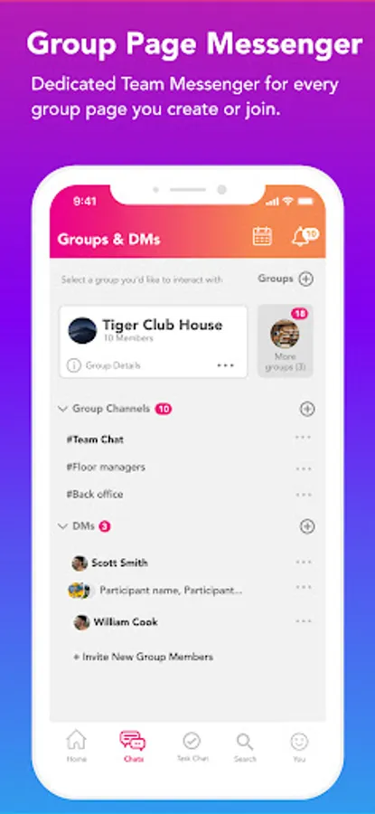 Chats. The Chats section of the app provides you to message with the group chat available to each group, or by Direct Message with other individuals, groups of individuals that you define. Message delivery is very fast and responsive. You can message text, photos, videos and any type of file or web link. Tasks create a special part of Messenger by opening a Task Chat for each task with each member of the Task.