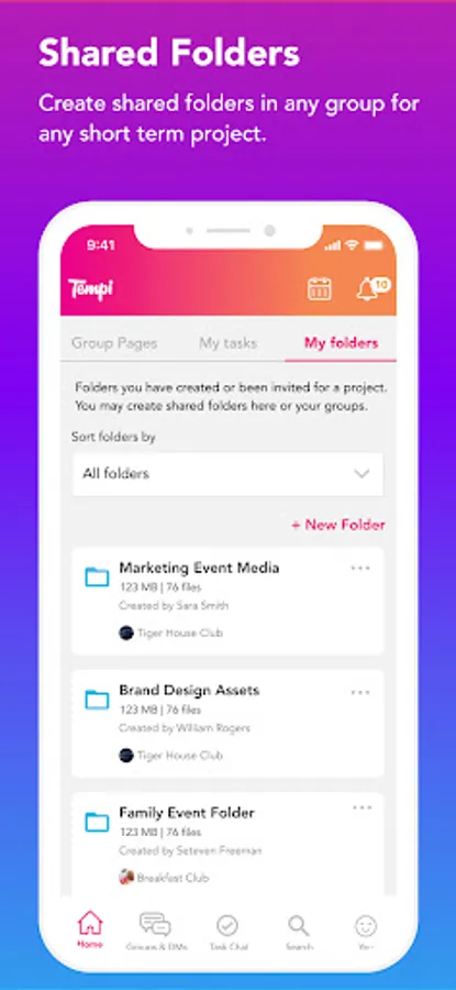 Shared Folders. Our Shared Folders feature creates Folders for your storage and sharing of files. In your group, go to Shared Files where all files posted on the Group Board or Shared in Group Chat / Group Direct messaging are stored for easy group member access. The third area is called Shared Folders where you create a Folder and use it for personal storage or invite anyone (a group member or someone outside of the group or even outside of Tempi via email to give them access to that folder) - to transfer files to them and back and forth.