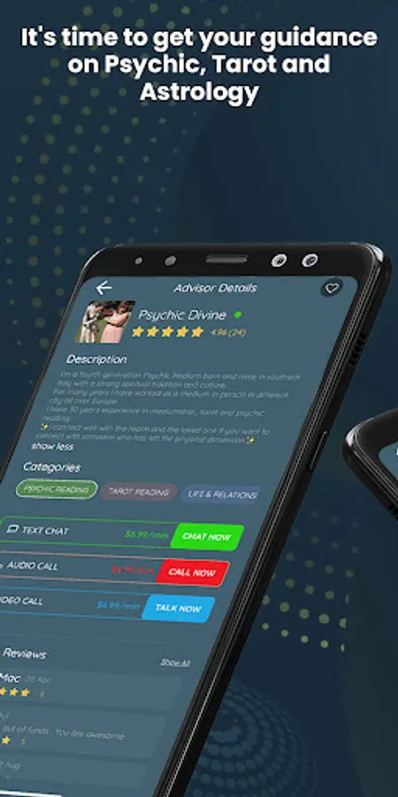 - vast selection of categories such as Psychic Medium Readings, Astrology, Trusted Tarot Card Reading, Reiki, Relationship Advice, Dream Analysis, and more.