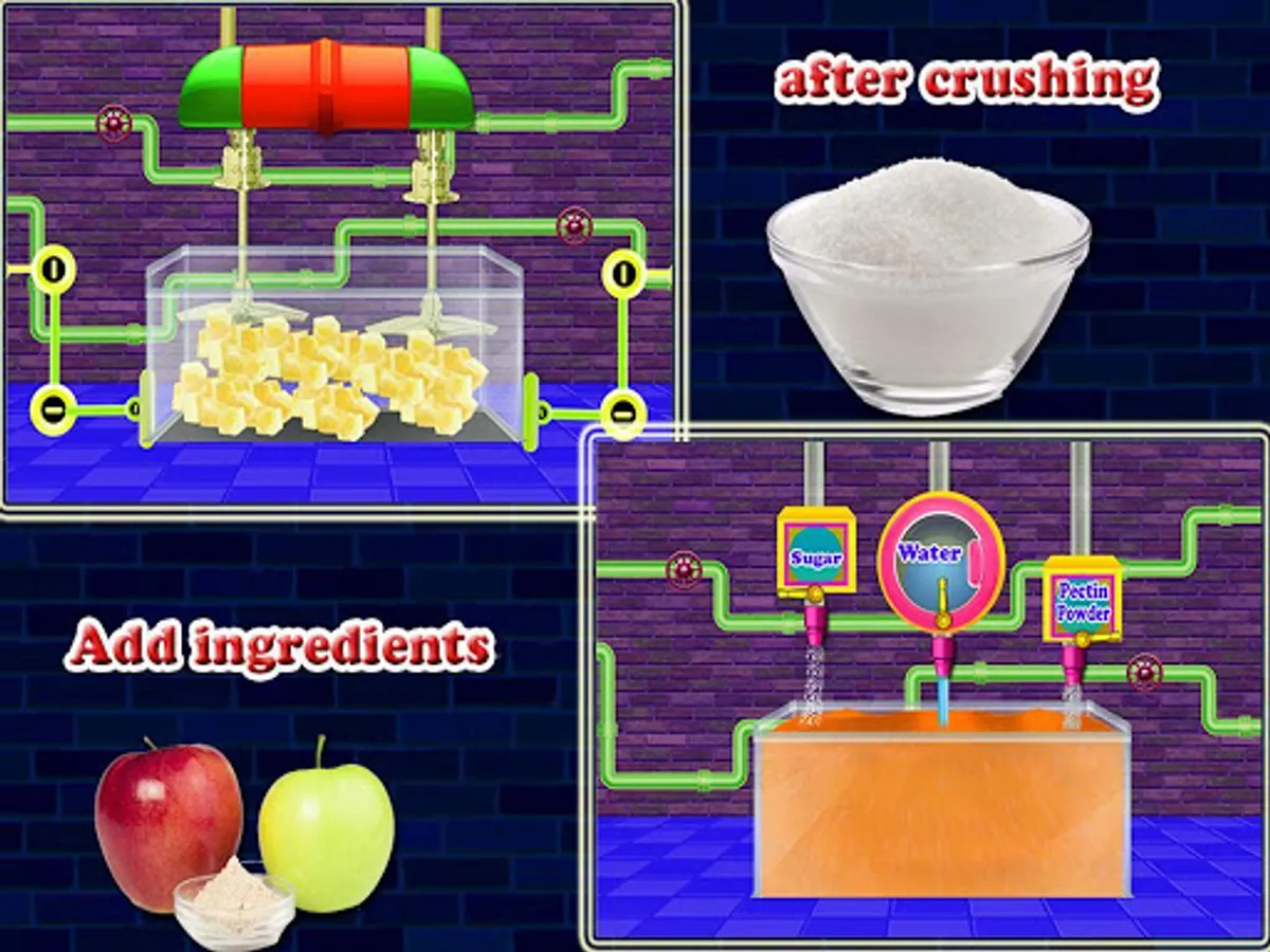 Separate healthy and rotten apple, mango, oranges and dates and send them to washing department. Wash the fruits perfectly and peel them off. Cut them into slices and to make delicious fruit juice in the master chef's kitchen. Fruit juice maker machines will make the juice of all fruits like apple, mango, orange, banana, and dates. Be an expert chef and collect the jelly juice in a separate container to boil it. During boiling, add ingredients in it to make it a jam like jelly. Splash the jelly juice in to the separate container and move to the next step. Immediately make it cool to transform it in a frozen shape. Pack yummy frozen dessert in the jars separately in the related fruit jam jars.