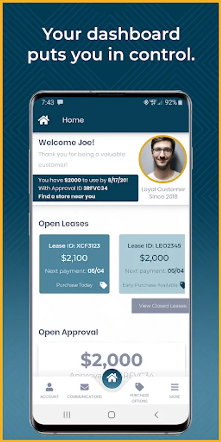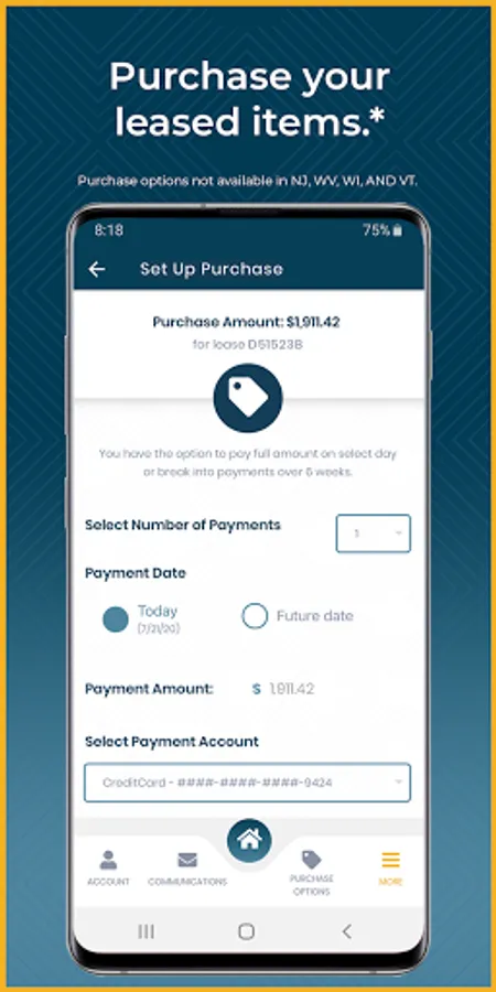 Keep it simple and manage your account 24/7 with the touch of a button. View open and closed leases as well as when payments are due. Make changes that fit your schedule and never miss a payment. Edit your lease payment due date to whenever makes sense for you. Ownership is at your fingertips - check what leases are available for purchase, and then setup your purchase (not available in NJ, VT, WI, and WV).