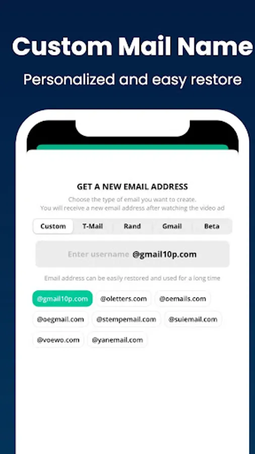 Generate secure, temporary emails associated with specific domains for enhanced privacy in registrations and online transactions.