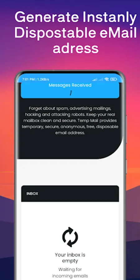 This app creates a virtual temporary email address. You can use it to verification or sign up for any website, and you can read incoming emails.
