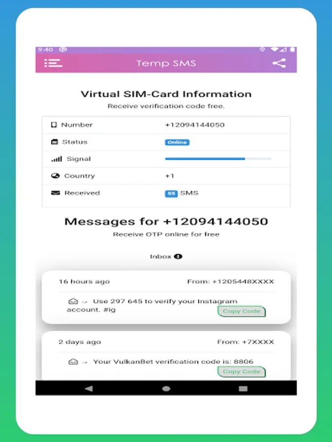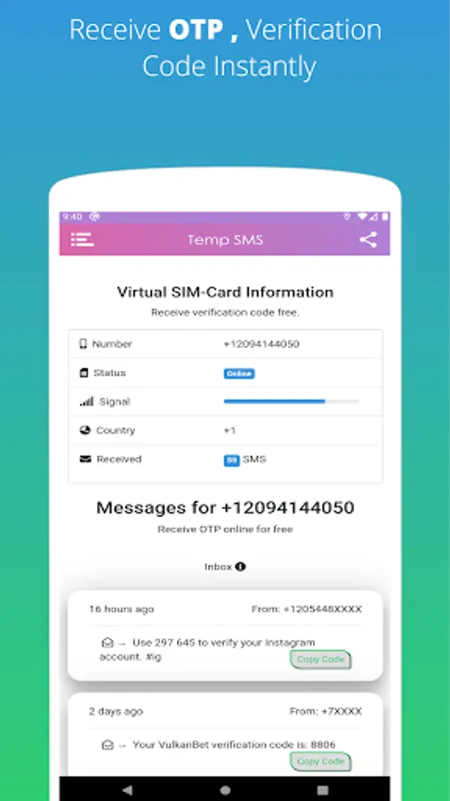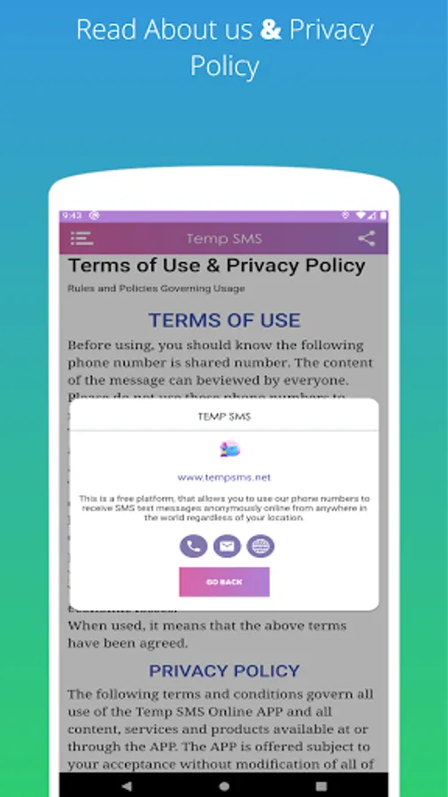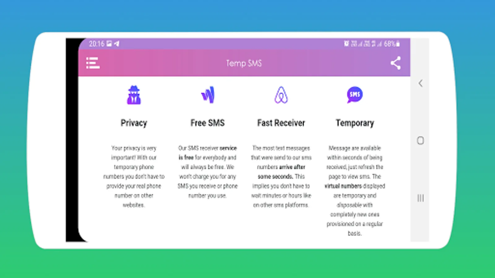 Temp SMS : Use this application to verify your account without having to use your own phone number. Temporary [Temp SMS] means that the number is online only for a few days, weeks or months, but not permanently online.