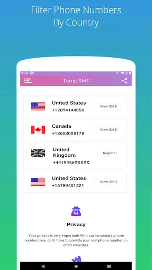 Disposable or temporary Virtual phone numbers is better option instead of using your personal phone numbers to receive SMS online from various sources. I made this platform because we know the importance of your privacy and security. If you use Temp SMS App service for receive SMS online for other development & testing purpose Temp, you will be from all the spamming and number leakages. I have made this platform only for you to overcome the hassles of spamming SMS in your inboxes. You can use our disposable mobile phone numbers to receive any type of SMS instantly and you do not have to expose your any private number too. This temporary mobile numbers can be used almost everywhere to receive SMS. Our virtual phone numbers permit you to verify and register for numerous websites, completely. Verify Facebook, Twitter, Google, and many more. This service is skillful to deliver you the virtual phone number online. It's also a quick fast service like a bulk SMS to receive text message online within second. This is a Temporary SMS platform for testing apps, website or other software tools For and also helps to protect your personal Mobile phone number.