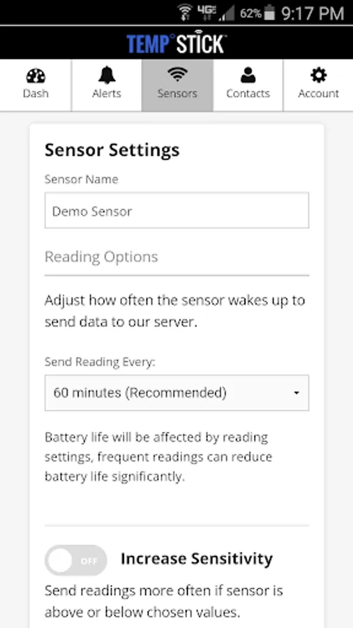 This app gives you access to all the features available for your Temp Stick sensor. Login from your Android mobile device and view sensor readings and history. Manage and customize your alert trigger rules and message settings. To demo the app, login with username and password 'demo'. Please call or email support if you require assistance, have found a bug or would like to request/suggest a specific features you need.