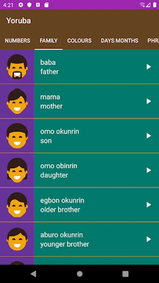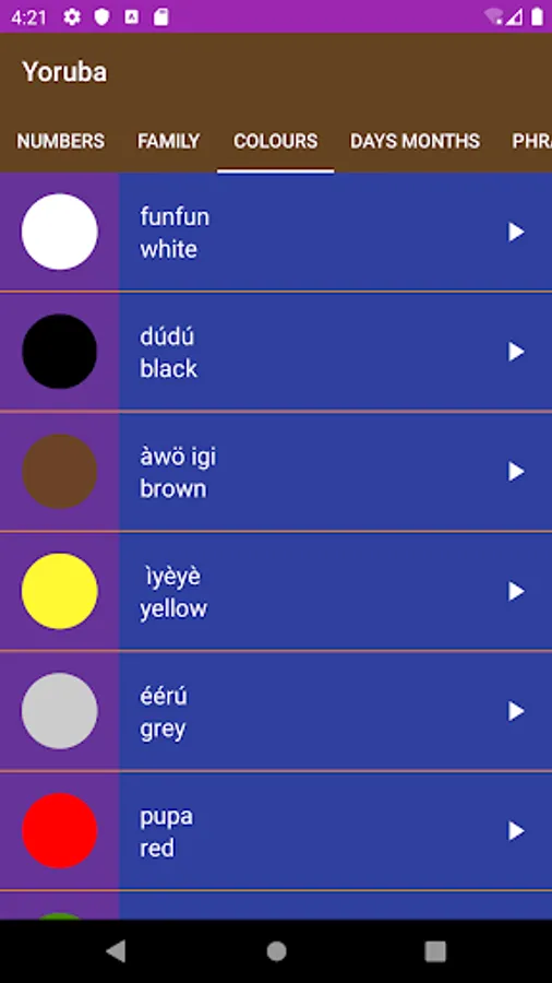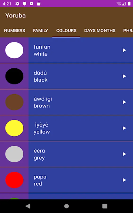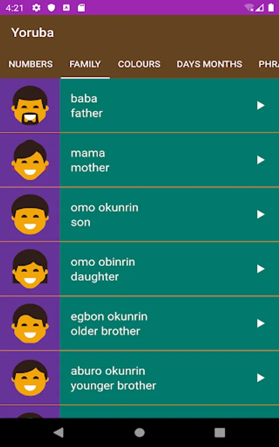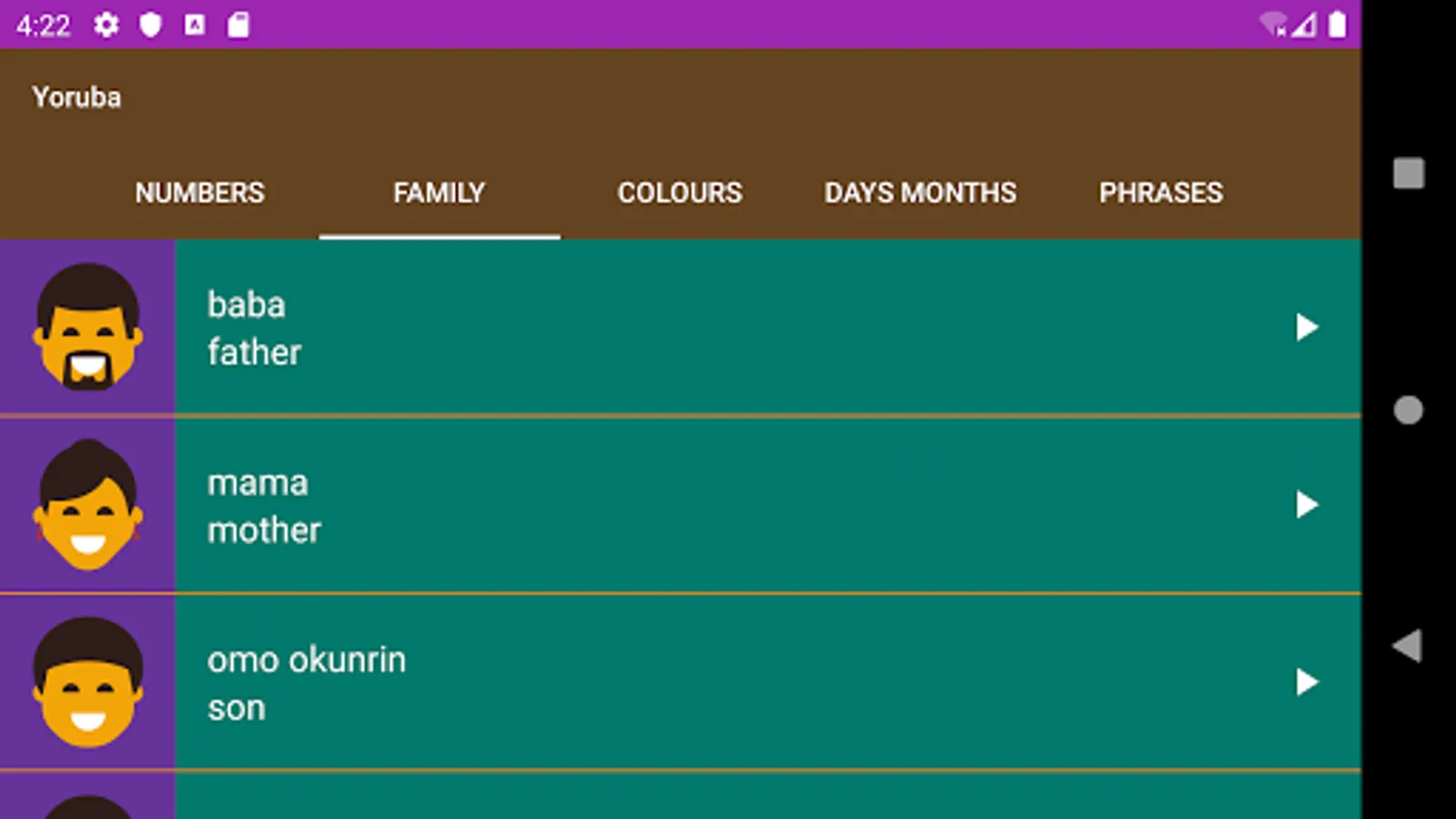 Learn Yoruba in easy steps is educative and fun to learn. It is a descriptive and interactive app with colourful images and audio playback translating English words into Yoruba language. App consists of six different and unique categories for broader and easy learning experience. Numbers, Family, Colours, Days of the week, Months of the year and Phrases words translation into Yoruba are shown below in phone and tablets user interface. User can scroll from left to right access different categories within the app. Learn Yoruba is illustrative with different background colours to make learning Yoruba language fun and captivating for young or older user. The key features of the app are the audio and picture images. The audio recording will enable users to learn the proper pronunciation of each list items.
