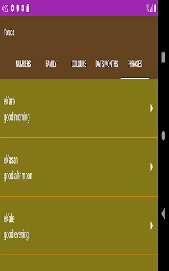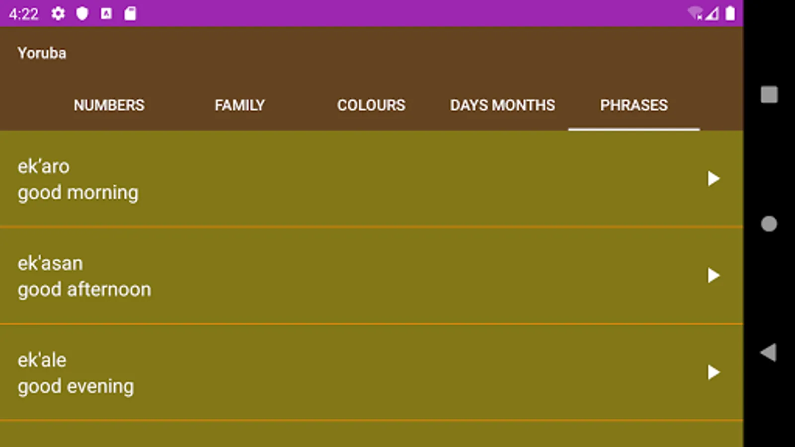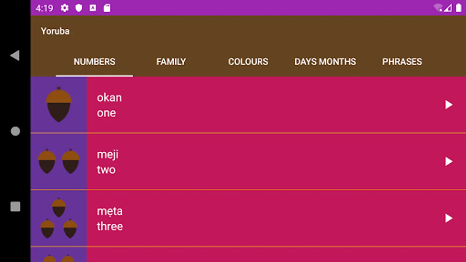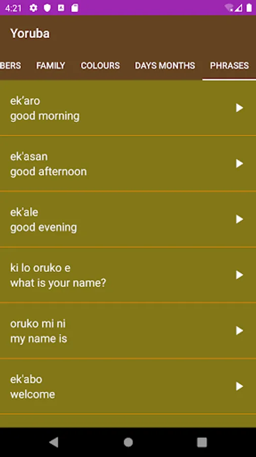 Learn Yoruba in easy steps is educative and fun to learn. It is a descriptive and interactive app with colourful images and audio playback translating English words into Yoruba language. App consists of six different and unique categories for broader and easy learning experience. Numbers, Family, Colours, Days of the week, Months of the year and Phrases words translation into Yoruba are shown below in phone and tablets user interface. User can scroll from left to right access different categories within the app. Learn Yoruba is illustrative with different background colours to make learning Yoruba language fun and captivating for young or older user. The key features of the app are the audio and picture images. The audio recording will enable users to learn the proper pronunciation of each list items.