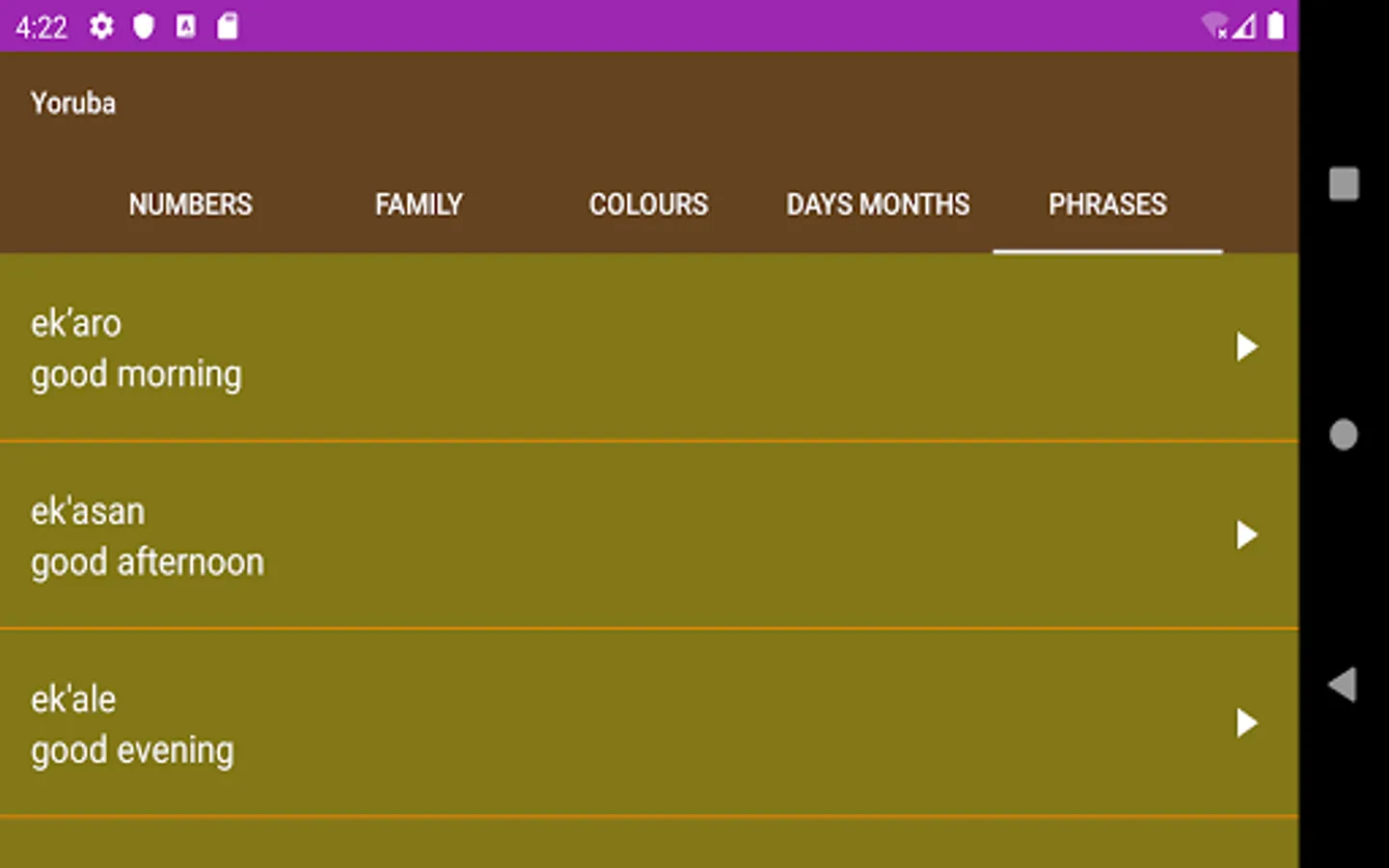 Images for family member has 12 pictures with Yoruba word at the top and English word below. Numbers has ten images with numbered (1 – 10). Colour list comes seven different shade of colours (White, black, Brown, Yellow, Grey, Red and Green) with colour images to match with their audio pronunciation in Yoruba. Days of the week (Monday -Sunday) and months of the year (January - December) has a total of 17 audio play backs for each particular word in Yoruba. Phrases has both short and longer words , for example ek’asan in Yoruba meaning ‘Good afternoon’. ‘What is is your name’ translated in Yoruba is ‘Ki lo oruko e’. Learn Yoruba app phone version can be displayed in portrait and landscape orientation. The app also comes in two tablet sizes to accommodate users with varying needs. Large tablet, 7-inch is in portrait and landscape. The X-large tablet, 10-inch tablet is also available in portrait and landscape.