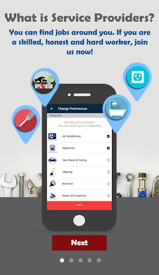 SERVICE PRO app build for Tradesmen, Professionals and Technicians is available in USA and Canada for more than 18 home and office categories, including Air Conditioning; Appliances; Cars Repair & Towing; Cleaning; Electrical; Decks and Carpentry; Flooring & Carpet; Handyman Service; Heating; IT & Computers; Keys & Locks; Lawn & Garden Care; Moving Services; Painting; Pest Control; Plumbing; Roof & Gutters; and Window repair and installation.