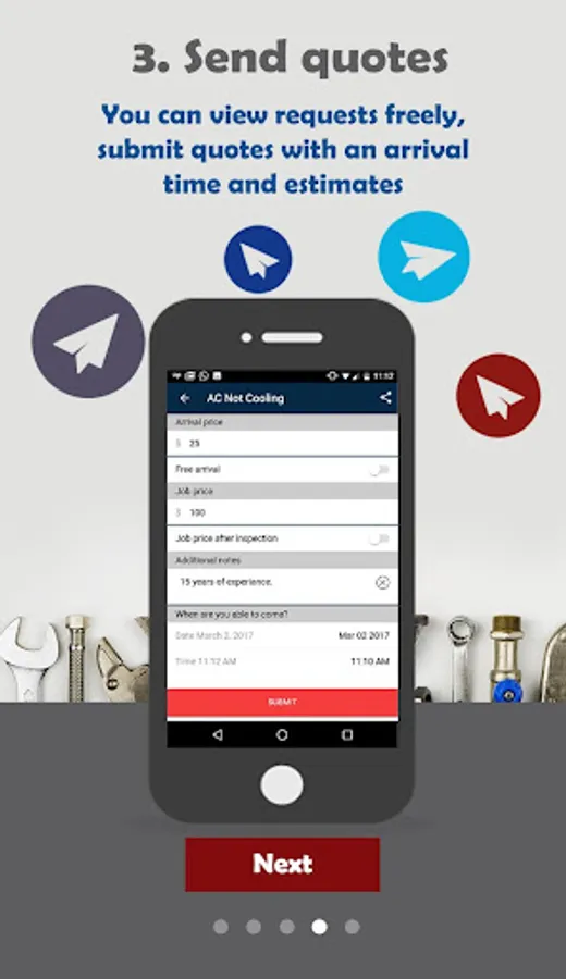 You get push notifications instantly alerting new requests and jobs. You can easily view job details and photo. On your mobile, you can provide a price quote, arrival time and communicate with the customer instantly.